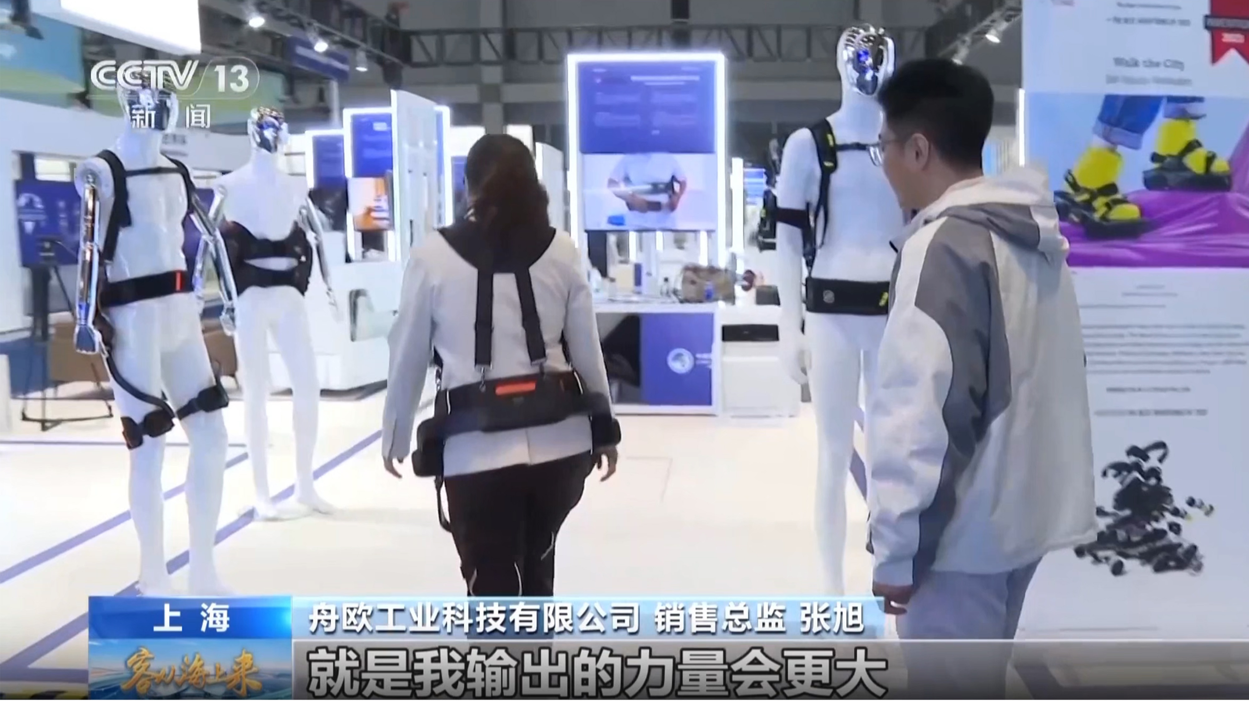 Zhang Xu, a Zhouou Industrial Technology Co., Ltd. értékesítési igazgatója bemutatta a CCTV riportereknek a kiállításon: "A segítő exoskeletont az idősek használhatják hegymászáshoz, feljutáshoz, és még néhány rehabilitációs edzéshez is." Ez az exoskeleton robot, mint a hordható mechanikus eszköz , az emberi ízületekkel összehangoltan működik szenzorokon keresztül, pontosan rögzítve a felhasználó lábmozgatási szándékok és automatikusan segítséget nyújt járás közben , alapvetően javítva a felhasználó mobilitás . A kiállítási élmény területén Zhang Xu segített egy riporternek tedd fel az exoskeleton robotot mindössze egy perc alatt . Amikor a riporter felállt és lépéseket tett, a készülék azonnal válaszolt , lábmozdulatokkal szinkronban nyújt támogatást. „Olyan érzés, mintha a lábam előretolnák” – mondta a riporter. Zhang Xu azt válaszolta: "Igen, ez nagyon megkönnyíti, különösen a térdeknél."